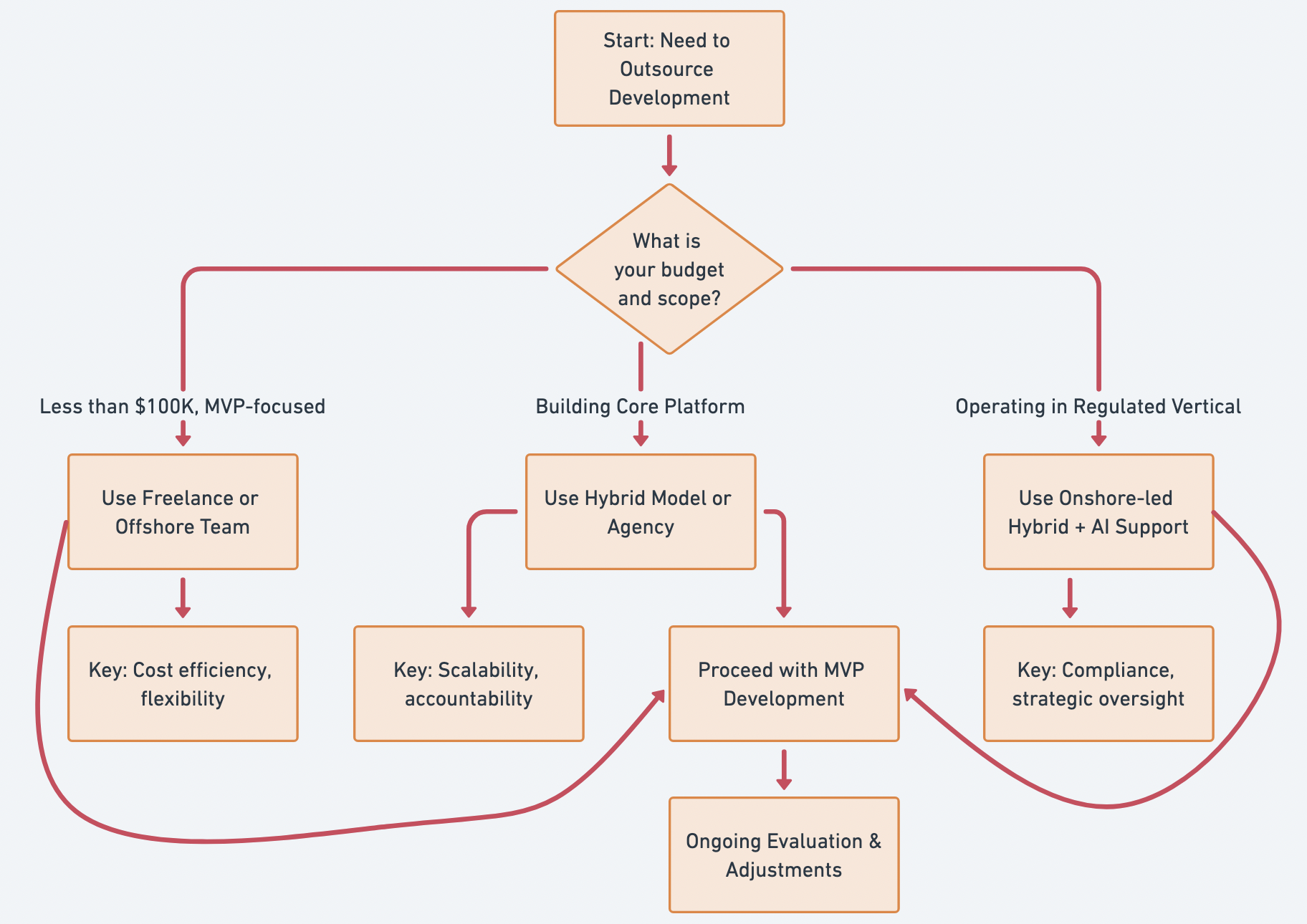 A decision tree helps organizations quickly match outsourcing models to project budgets, regulatory requirements, and technical complexity, improving accuracy in early planning.